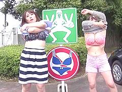 野外で!エロい標識の影響を受けたお姉さんたちのひととき!ああ…でちゃった…!